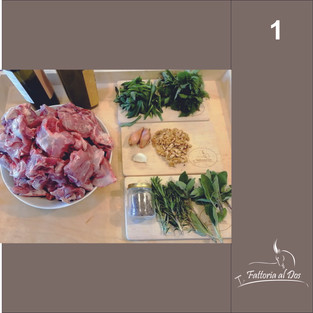 Quanto la carne sarà quasi pronta e il vino evaporato quasi del tutto, salare e inserire il trito. A questo punto alzare la fiamma e rosolare la carne girandola senza romperla perché a questo punto sarà cotta e si staccherà dall'osso.