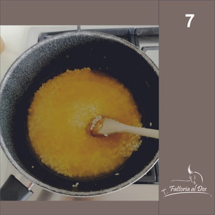 In una pentola capiente preriscaldata verso il riso a secco. Questo metodo fa sì che la tostatura del riso avvenga senza liquidi o grassi in modo tale che il chicco si tosti uniformemente e quindi la cottura darà più gusto e la risottatura sarà più cremosa.